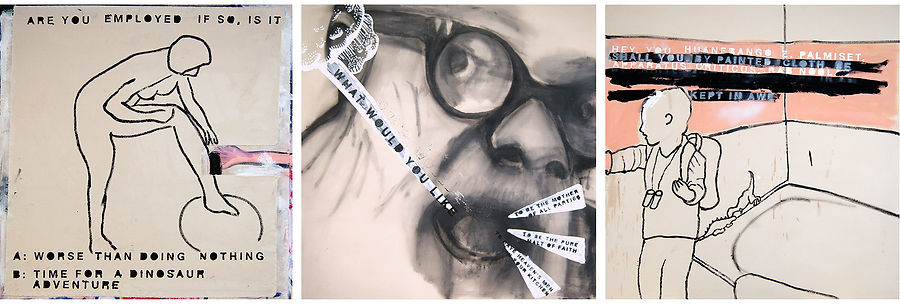 Right: HUNT_SEARCH_ibid (pencil, recycled printer ink, collage on dust sheet).